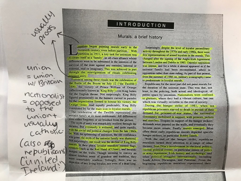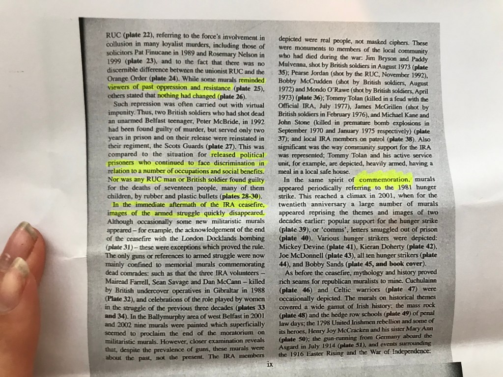 I’ve learned from a BBC article, that murals used to be a Unionist tradition, which predated the partition in 1921, but from roughly 1981 onwards, Nationalists joined in to support their Republican inmates in British prisons. Protestant murals tended to focus on the link between Northern Ireland and Britain, while Catholic murals targeted more international issues, such as situations in places like Palestine. “The Arts Council of Northern Ireland has spent several million pounds removing supposedly offensive murals (often of armed men in balaclavas) and replacing them with murals of cultural and sporting figures.” Although some muralists are trying their best to replace the very one-sided murals with those celebrating cultural and sporting heroes, often they’re replaced once again, proving once more how far we still have to go before we achieve a shared identity in N.I.
